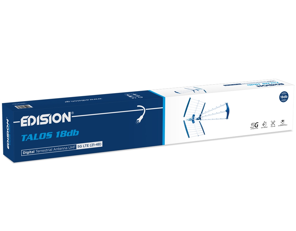 Zemaljska antena DVB-T2 Edision TALOS 18 dB ADVANCED PLUS . Dobit 13 dB , Yagi reflektori za Cut-Off dolaznih  smatnji sa zadnje strane antene.CH 21-48 ( 470 to 694 Mhz) . 4G i 5G LTE Cut-Off.TRIPLE sustav za stabilniji prijem slabih signala.Dužina:105 cm.
